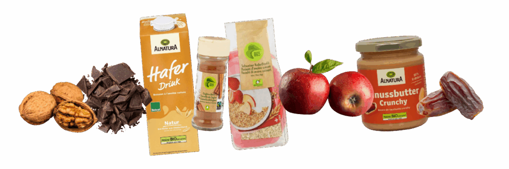 Chocolat noir haché, beurre de cacahuète, éclats de noix, fruits frais et de saison, dattes coupées en lanières, éclats de fèves de cacao, …